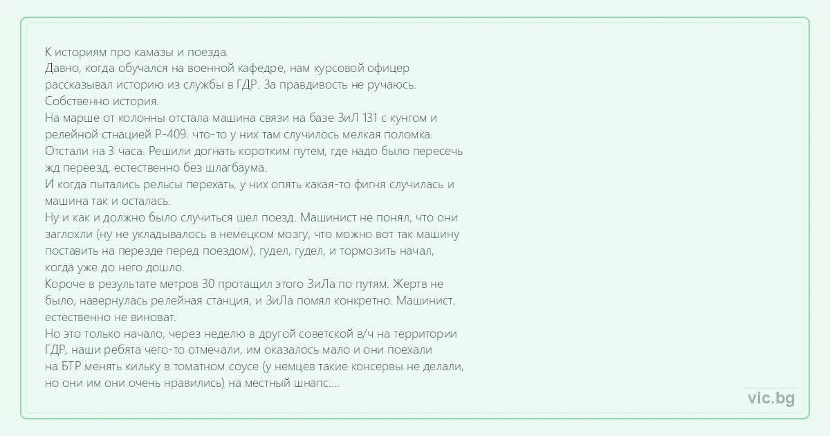 К историям про камазы и поезда. Давно, когда обучался на военной кафедре, нам курсовой офицер рассказывал историю из службы в ГДР. За правдивость не ручаюсь. Собственно история. На марше от колонны отстала машина связи на базе ЗиЛ 131 с кунгом и релейной стнацией Р-409. что-то у них там случилось мелкая поломка. Отстали на 3 часа. Решили догнать коротким путем, где надо было пересечь жд переезд, естественно без шлагбаума. И когда пытались рельсы перехать, у них опять какая-то фигня случилась и машина так и осталась. Ну и как и должно было случиться шел поезд. Машинист не понял, что они заглохли (ну не укладывалось в немецком мозгу, что можно вот так машину поставить на перезде перед поездом), гудел, гудел, и тормозить начал, когда уже до него дошло. Короче в результате метров 30 протащил этого ЗиЛа по путям. Жертв не было, навернулась релейная станция, и ЗиЛа помял конкретно. Машинист, естественно не виноват. Но это только начало, через неделю в другой советской в/ч на территории ГДР, наши ребята чего-то отмечали, им оказалось мало и они поехали на БТР менять кильку в томатном соусе (у немцев такие консервы не делали, но они им они очень нравились) на местный шнапс. Ну и когда возвращались на БТР, а это уже было темно, то заблудились, увидели что едет какая-то машина и наверное там дорога. Это и правда была дорога, только железная и по ней перегоняли дизель со станции на станцию без вагонов. Короче в результате советский БТР свалил дизель с путей, перехал через него и встрял носом в землю. Опять без жертв, но с травмами. Так вот на следующее утро немецкие газеты вышли с заголовком "Месть русских", где на полном серьезе описывалось как русские выследили немецкий дизель и отомстили за ЗиЛа.