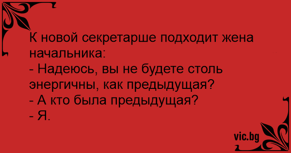 Frun till direktörens nya sekreterare: - Nu hoppas jag att fröken inte är lika flirtig och lättsinnig som min mans förra sekreterare. - Och vem var det då? Frun lätt småleende: - Det var jag...