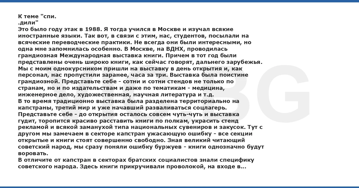 К теме "спи. .дили" Это было году этак в 1988. Я тогда учился в Москве и изучал всякие иностранные языки. Так вот, в связи с этим, нас, студентов, посылали на всяческие переводческие практики. Не всегда они были интересными, но одна мне запомнилась особенно. В Москве, на ВДНХ, проводилась грандиозная Международная выставка книги. Причем в тот год были представлены очень широко книги, как сейчас говорят, дальнего зарубежья. Мы с моим однокурсником пришли на выставку в день открытия и, как персонал, нас пропустили заранее, часа за три. Выставка была поистине грандиозной. Представьте себе - сотни и сотни стендов не только по странам, но и по издательствам и даже по тематикам - медицина, инженерное дело, художественная, научная литература и т.д. В то время традиционно выставка была разделена территориально на капстраны, третий мир и уже начавший разваливаться соцлагерь. Представьте себе - до открытия осталось совсем чуть-чуть и выставка гудит, торопится красиво расставить книги по полкам, украсить стенд рекламой и всякой заманухой типа национальных сувениров и закусок. Тут с другом мы замечаем в секторе капстран ужасающую ошибку - все секции открытые и книги стоят совершенно свободно. Зная великий читающий советский народ, мы сразу поняли ошибку буржуев - книги однозначно будут воровать. В отличите от капстран в секторах братских социалистов знали специфику советского народа. Здесь книги прикручивали проволокой, на входе в секции висели цепи, стояли охранники, готовые проверять сумки и т.д. Самое интересное то, что в воздухе на всех славянских языках разносилось: "Украдут, укрАдут, свОруют, сворУют, спи..дят". И тут началось страшное - выставку открыли и самый читающий народ ринулся в секции. Социки встретили наших во всеоружии. Но надо было видеть буржуев!!! Через час резиновые улыбки их начали исчезать и выражения лиц приобретать панические черты. Потому что книги исчезали с такой скоростью - и главное с таким мастерством, что ихний Копперфильд - просто мальчишка!! В воздухе начало носиться "stolen" "volee", т.е. то же самое "спи..дить" только уже в прошедшем времени. Книги таяли, а не вынимать новые и не ставить их вместо украденных невозможно - стенды приобретали вид пустующих полок в советских гастрономах минут за 20-30. У форинов заметно дрожали руки, они обращались к охране. Но охранники тогда тоже были читающими. В общем, для буржуев это был не просто культурный шок, а прямо Армагеддон какой-то. Помню стоит америкос из секции "медицина" и орет: "Where is vulvа?" подразумевая, что только что спи..дили огромный метр на метр медицинский фотоальбом с изображением этой самой вульвы. Короче враг капитулировал в первый же день и сдался без аннексий и контрибуций. Никогда не забуду сиротливую бумажку на огромном стенде, когда то заполненном модным чтивом, и откуда мы с другом сп..ли: он- книгу "Джон Леннон", а я - "Авторизованную биографию Битлз". Кривая, выведенная дрожащей рукой надпись на русском гласила: "Товариш, не унаси пожалуста книги с тобой!" Слава великому самому читающему в мире советскому народу!