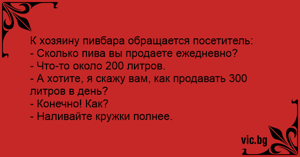 До власника пив бару звертається відвідувач: - Скільки пива ви продаєте щодня? - Близько 200 літрів. - А хочете, я скажу вам, як продавати 300 літрів в день? - Звичайно! Як? - Наливайте повні кухлі.