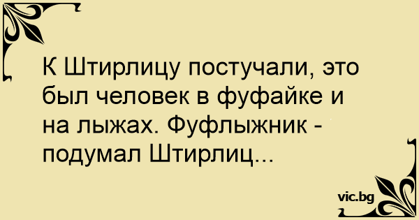 К Штирлицу постучали, это был человек в фуфайке и на лыжах. Фуфлыжник - подумал Штирлиц...