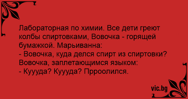 Лабораторная по химии. Все дети греют колбы спиртовками, Вовочка - горящей бумажкой. Марьиванна: