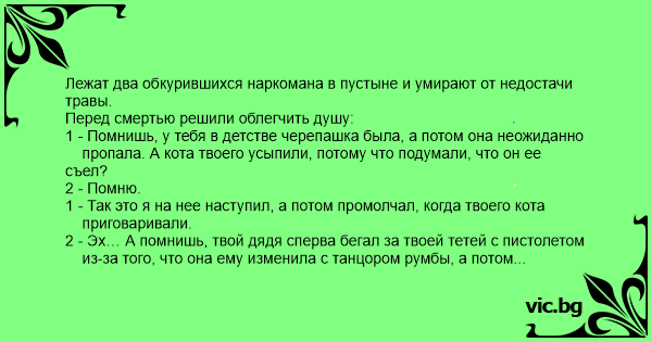 Лежат два обкурившихся наркомана в пустыне и умирают от недостачи травы.