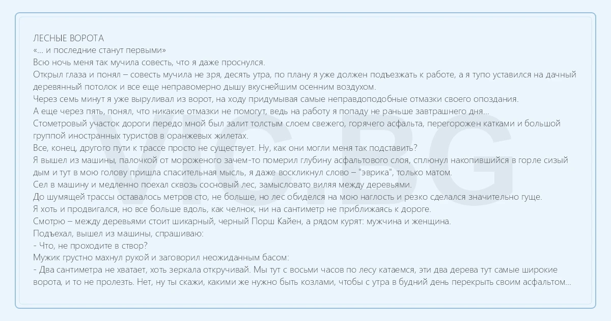 ЛЕСНЫЕ ВОРОТА «… и последние станут первыми» Всю ночь меня так мучила совесть, что я даже проснулся. Открыл глаза и понял – совесть мучила не зря, десять утра, по плану я уже должен подъезжать к работе, а я тупо уставился на дачный деревянный потолок и все еще неправомерно дышу вкуснейшим осенним воздухом. Через семь минут я уже выруливал из ворот, на ходу придумывая самые неправдоподобные отмазки своего опоздания. А еще через пять, понял, что никакие отмазки не помогут, ведь на работу я попаду не раньше завтрашнего дня... Стометровый участок дороги передо мной был залит толстым слоем свежего, горячего асфальта, перегорожен катками и большой группой иностранных туристов в оранжевых жилетах. Все, конец, другого пути к трассе просто не существует. Ну, как они могли меня так подставить? Я вышел из машины, палочкой от мороженого зачем-то померил глубину асфальтового слоя, сплюнул накопившийся в горле сизый дым и тут в мою голову пришла спасительная мысль, я даже воскликнул слово – "эврика", только матом. Сел в машину и медленно поехал сквозь сосновый лес, замысловато виляя между деревьями. До шумящей трассы оставалось метров сто, не больше, но лес обиделся на мою наглость и резко сделался значительно гуще. Я хоть и продвигался, но все больше вдоль, как челнок, ни на сантиметр не приближаясь к дороге. Смотрю – между деревьями стоит шикарный, черный Порш Кайен, а рядом курят: мужчина и женщина. Подъехал, вышел из машины, спрашиваю: - Что, не проходите в створ? Мужик грустно махнул рукой и заговорил неожиданным басом: - Два сантиметра не хватает, хоть зеркала откручивай. Мы тут с восьми часов по лесу катаемся, эти два дерева тут самые широкие ворота, и то не пролезть. Нет, ну ты скажи, какими же нужно быть козлами, чтобы с утра в будний день перекрыть своим асфальтом выезд для всего дачного поселка…? Я сложил одно зеркало на своей машинке и сказал: - Давайте может я попробую, все-таки моя поуже вашей будет. - Да, ну, без вариантов, не пройдешь, только бочину поцарапаешь, я уж пытался и так – и сяк. - Ну, а вдруг, спешить-то больше некуда. Мужик пожал плечами, нехотя вскарабкался в машину и сдал назад. Я, как и подозревал, спокойно протиснулся в лесные ворота даже с одним торчащим зеркалом. Как только моя машина миновала невидимую, но принципиальную черту, в мужика вселились черти, он стал бегать кругами и что есть дури пинать лаковыми штиблетами не в чем неповинные сосны, его мягкий бас превратился почти в хрип: - Cуka! Я сейчас пойду, их там завалю всех! Пусть… убирают обратно свой асфальт, или срочно сушат его, я не знаю… Я разогнул свое зеркало и сказал: - Если хотите, могу довести вас до метро. Свирепого мужика очень обидело слово «метро» и он истерично ответил: - Нет уж спасибо, не надо, всего хорошего, будь здоров. Но женщина быстро подхватила из Кайена сумочку и сказала: - Ой, а правда, можно мне до метро? Мужик оскорбился и пробасил: - Ты поедешь на метро? - А куда мне деваться? Я должна быть на работе, ты же знаешь. Мужик ничего не ответил, только спросил есть ли у меня топор. Топора не оказалось и мы поехали. Километров десять моя пассажирка молчала, а потом, вдруг неожиданно рассмеялась и заговорила каким-то дурашливым низким голосом: - Давай для дачи купим Порш Кайен, как бы не испортилась дорога, все лохи на своих помойках сядут на задницу, а мы одни на Кайене проедем 