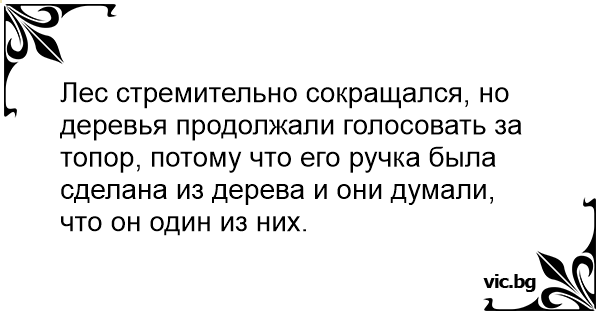 Лес стремительно сокращался, но деревья продолжали голосовать за топор, потому что его ручка была сделана из дерева и они думали, что он один из них.