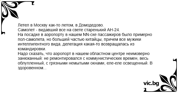 Летел в Москву как-то летом, в Домодедово. Самолет - видавший все на свете старенький АН-24. На посадке в аэропорту в нашем NN-ске пассажиров было примерно пол-самолета, но большей частью китайцы, причем все мужики интеллигентного вида, делегация какая-то возвращалась из командировки. Надо сказать, что аэропорт в нашем областном центре неимоверно занюханный: не ремонтировался с коммунистических времен, весь облупленный, с грязными немытыми окнами, еле-еле освещенный. В здоровенном здании всегда пусто и холодно, не работают зал ожидания и буфет, нет даже авиакассы, воняет толчком. Народ появляется только непосредственно перед посадкой. Китайцы же, судя по всему, приехали много заранее и, удивленно озираясь, шарахались по пустынному чудо-аэропорту. Прошли регистрацию и стали в отстойнике ждать посадки. Вышла какая-то тетя, отперла дверь и предложила пешком двигаться под дождиком через пол-поля до самолета. Китайцы удивились еще раз - видимо предполагали, что их все-таки не поведут, а повезут. Подойдя к самолету, китайцы окончательно впали в ступор: перед ними предстало почти черное от грязи и копоти, с кучей вмятин на корпусе корыто с пропеллерами. Внутри все было тоже весьма засижено и попахивало блевотиной. Вы видели когда-нибудь БЕЛЫХ китайцев с большими круглыми глазами? Нет?? А я видел... :) Как только расселись, китайцы достали фляжки, явно не с водой, и стали нервно отхлебывать. Взлетели однако без проблем. Тем не менее, вскоре самолет стал регулярно проваливаться в воздушные ямы. Китайцы запели песни. Наши ржали. На подходе к Домодедово, почти перед самой посадкой, я внимательно смотрел в окно, некоторые китайцы тоже. Надо заметить, что у АН-24 иллюминаторы выпуклые, так что если просунуть голову, то весьма неплохо видно не только вбок, но и вперед. Перед началом взлетно-посадочной полосы я вдруг разглядел сгоревший самолет, вроде ТУ-134, с отвалившимся хвостом, заботливо прикрытый маскировочной сеткой. Его увидел не я один - пара китайцев, отчаянно жестикулируя, стала что-то орать товарищам. Некоторых китайцев прошиб холодный пот. Приземлившись, выходили они очень быстро. Что там за сгоревший самолет лежал я так и не понял, накануне никаких сообщений про аварию в прессе не было. Это, наверное, было что-то вроде пожелания "Счастливого пути!" по-домодедовски.