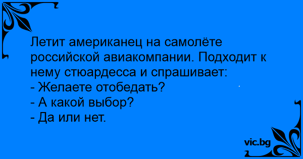 Amerikietis skrenda “Aerofloto” lėktuvu. Prieina stiuardesė: - Ar norite pusryčių? - O koks pasirinkimas? - Taip, arba ne.