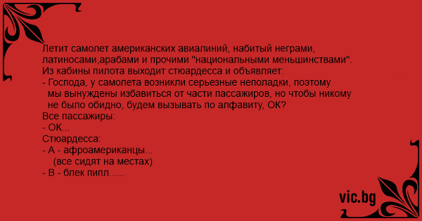 Летит самолет американских авиалиний, набитый неграми, латиносами,арабами и прочими "национальными меньшинствами".