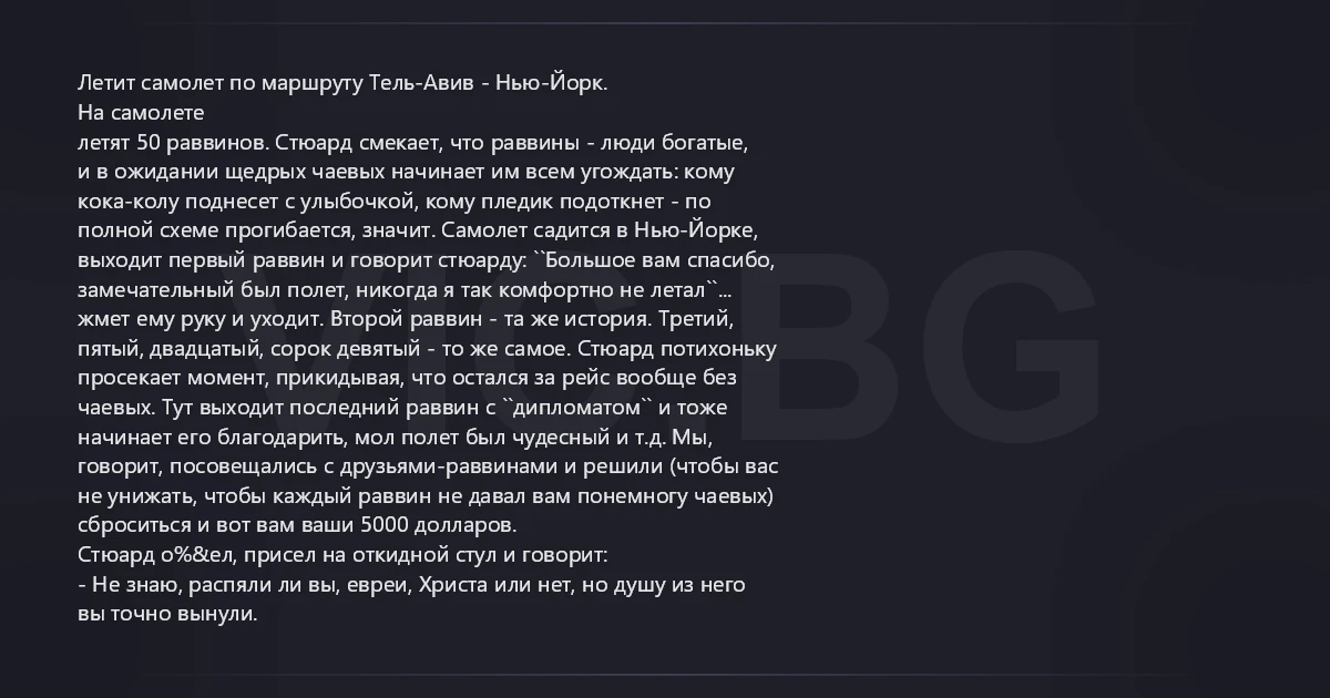 Летит самолет по маршруту Тель-Авив - Нью-Йорк. На самолете летят 50 раввинов. Стюард смекает, что раввины - люди богатые, и в ожидании щедрых чаевых начинает им всем угождать: кому кока-колу поднесет с улыбочкой, кому пледик подоткнет - по полной схеме прогибается, значит. Самолет садится в Нью-Йорке, выходит первый раввин и говорит стюарду: ``Большое вам спасибо, замечательный был полет, никогда я так комфортно не летал``... жмет ему руку и уходит. Второй раввин - та же история. Третий, пятый, двадцатый, сорок девятый - то же самое. Стюард потихоньку просекает момент, прикидывая, что остался за рейс вообще без чаевых. Тут выходит последний раввин с ``дипломатом`` и тоже начинает его благодарить, мол полет был чудесный и т.д. Мы, говорит, посовещались с друзьями-раввинами и решили (чтобы вас не унижать, чтобы каждый раввин не давал вам понемногу чаевых) сброситься и вот вам ваши 5000 долларов. Стюард о%&ел, присел на откидной стул и говорит: - Не знаю, распяли ли вы, евреи, Христа или нет, но душу из него вы точно вынули.