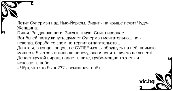 Летит Супермэн над Нью-Йорком. Видит - на крыше лежит Чудо-Женщина.