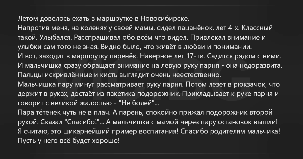 Летом довелось ехать в маршрутке в Новосибирске. Напротив меня, на коленях у своей мамы, сидел пацанёнок, лет 4-х. Классный такой. Улыбался. Расспрашивал обо всём что видел. Привлекал внимание и улыбки сам того не зная. Видно было, что живёт в любви и понимании. И вот, заходит в маршрутку паренёк. Наверное лет 17-ти. Садится рядом с ними. И мальчишка сразу обращает внимание на левую руку парня - она недоразвита. Пальцы искривлённые и кисть выглядит очень неестественно. Мальчишка пару минут рассматривает руку парня. Потом лезет в рюкзачок, что держит в руках, достаёт из пакетика подорожник. Прикладывает к руке парня и говорит с великой жалостью - "Не болей"... Пара тётенек чуть не в плач. А парень, спокойно прижал подорожник второй рукой. Сказал "Спасибо!"... А мальчишка с мамой через пару остановок вышли! Я считаю, это шикарнейший пример воспитания! Спасибо родителям мальчика! Пусть у него всё будет хорошо!