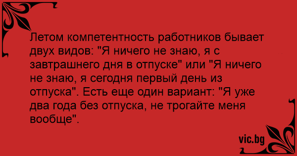 Летом компетентность работников бывает двух видов: "Я ничего не знаю, я с завтрашнего дня в отпуске" или "Я ничего не знаю, я сегодня первый день из отпуска". Есть еще один вариант: "Я уже два года без отпуска, не трогайте меня вообще".