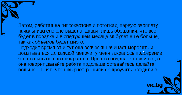 Летом, работал на гипсокартоне и потолках, первую зарплату начальница еле еле выдала, давая, лишь обещания, что все будет в порядке и в следующем месяце зп будет еще больше, так как объемов будет много.