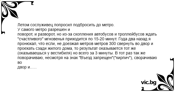 Летом сослуживец попросил подбросить до метро. У самого метро разрешен и поворот, и разворот, но из-за скопления автобусов и троллейбусов ждать "счастливого" мгновенья приходится по 15-20 минут. Года два назад я пронюхал, что если, не доезжая метров метров 300 свернуть во двор и проехать сзади жилого дома, то результат оказывается тот же (оказываешься у вестибиля) но всего за 3 минуты. В тот раз так же поворачиваю, несмотря на знак "Въезд запрещен"("кирпич"), сворачиваю во двор и... гаишники машут мне волшебной палочкой (это во дворе-то!). Потрясенный до глубины души, выхожу из авто и в состоянии, близком к прострации, спрашиваю: - А ЗДЕСЬ-то вы что делаете? Прапорщик, разомлевший от жары, лениво тянет: - Нарушаем, товарищ водитель! Получается, я весь такой молодец, а ОНИ(!!!) нарушают!