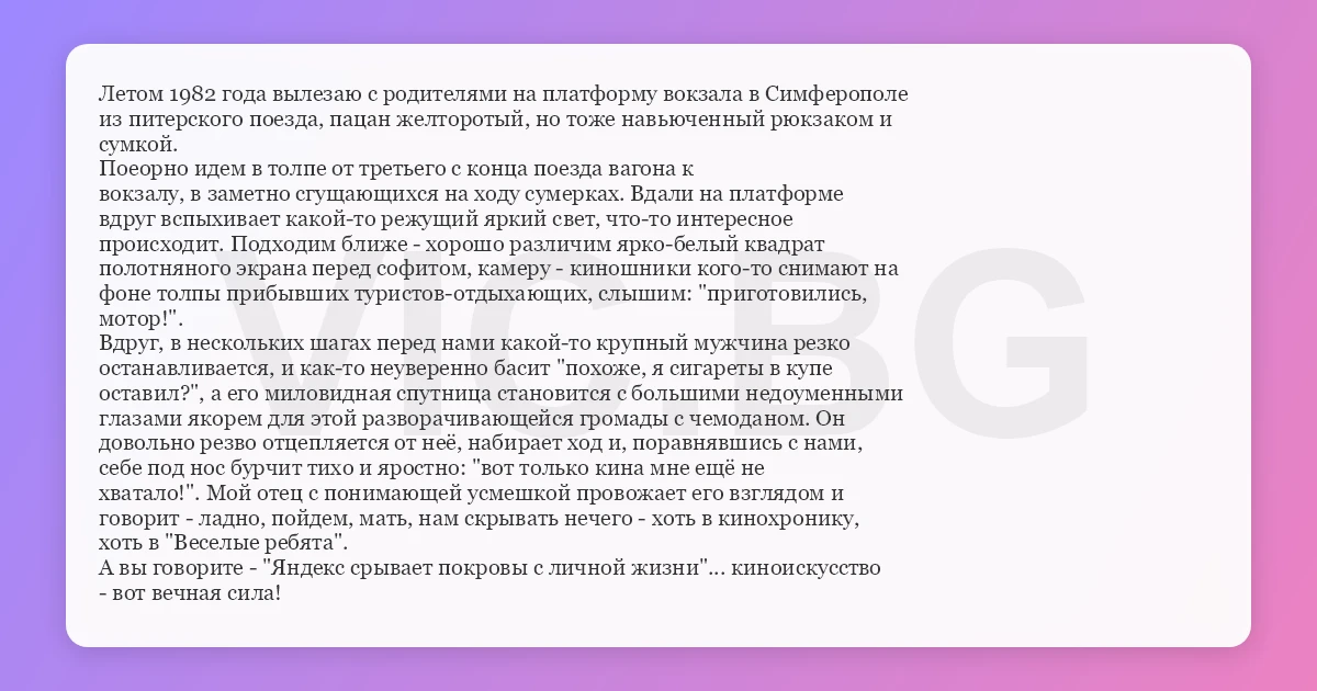 Летом 1982 года вылезаю с родителями на платформу вокзала в Симферополе из питерского поезда, пацан желторотый, но тоже навьюченный рюкзаком и сумкой. Поеорно идем в толпе от третьего с конца поезда вагона к вокзалу, в заметно сгущающихся на ходу сумерках. Вдали на платформе вдруг вспыхивает какой-то режущий яркий свет, что-то интересное происходит. Подходим ближе - хорошо различим ярко-белый квадрат полотняного экрана перед софитом, камеру - киношники кого-то снимают на фоне толпы прибывших туристов-отдыхающих, слышим: "приготовились, мотор!". Вдруг, в нескольких шагах перед нами какой-то крупный мужчина резко останавливается, и как-то неуверенно басит "похоже, я сигареты в купе оставил?", а его миловидная спутница становится с большими недоуменными глазами якорем для этой разворачивающейся громады с чемоданом. Он довольно резво отцепляется от неё, набирает ход и, поравнявшись с нами, себе под нос бурчит тихо и яростно: "вот только кина мне ещё не хватало!". Мой отец с понимающей усмешкой провожает его взглядом и говорит - ладно, пойдем, мать, нам скрывать нечего - хоть в кинохронику, хоть в "Веселые ребята". А вы говорите - "Яндекс срывает покровы с личной жизни"... киноискусство - вот вечная сила!