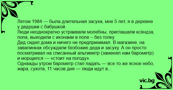Дед сидел дома и ничего не предпринимал. В магазине, на завалинках обсуждали безбожие деда и засуху. А он просто посматривал на списанный альтиметр (заменял нам барометр) и морщился — «стоит на погоду».