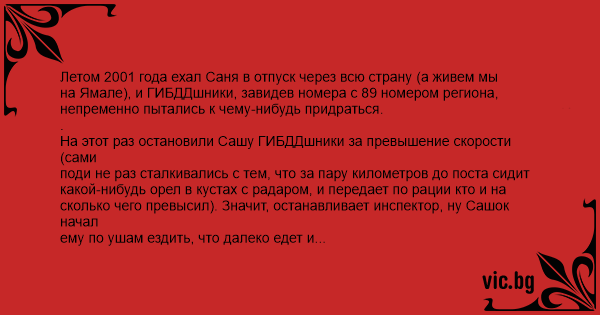 непременно пытались к чему-нибудь придраться. . На этот раз остановили Сашу ГИБДДшники за превышение скорости (сами поди не раз сталкивались с тем, что за пару километров до поста сидит какой-нибудь орел в кустах с радаром, и передает по рации кто и на сколько чего превысил). Значит, останавливает инспектор, ну Сашок начал ему по ушам ездить, что далеко едет и очень торопится, а инспектор в ответ - зайди в "будку", там все старшему офицеру и объясняй. Заходит он в кабинетик, там сидит майор, ну Санек начинает ему что-то объяснять, а майор показывает на свою грудь (на которой рядом с личным жетоном висит значок примерно с таким содержанием: "во избежание недоразумений.... ваш разговор записывается на диктофон") и многозначительно так смотрит на Санька. Картина маслом: Саня: - Ну товарищ майор, я понимаю что немного поторопился (показывает пятерней ладонь, типа 50 рублей) Майор: - Нет, ты очень торопился (показывает две ладони и открывает посередине какую-то большую книгу) Саня кладет в книгу 100 рублей. Майор: - Ну ладно, на первый раз ограничимся предупреждением.