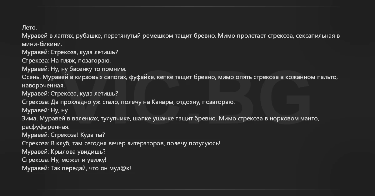 Лето. Муравей в лаптях, рубашке, перетянутый ремешком тащит бревно. Мимо пролетает стрекоза, cекcапильная в мини-бикини. Муравей: Стрекоза, куда летишь? Стрекоза: На пляж, позагораю. Муравей: Ну, ну басенку то помним. Осень. Муравей в кирзовых сапогах, фуфайке, кепке тащит бревно, мимо опять стрекоза в кожанном пальто, навороченная. Муравей: Стрекоза, куда летишь? Стрекоза: Да прохладно уж стало, полечу на Канары, отдохну, позагораю. Муравей: Ну, ну. Зима. Муравей в валенках, тулупчике, шапке ушанке тащит бревно. Мимо стрекоза в норковом манто, расфуфыренная. Муравей: Стрекоза! Куда ты? Стрекоза: В клуб, там сегодня вечер литераторов, полечу потусуюсь! Муравей: Крылова увидишь? Стрекоза: Ну, может и увижу! Муравей: Так передай, что он муд@к!