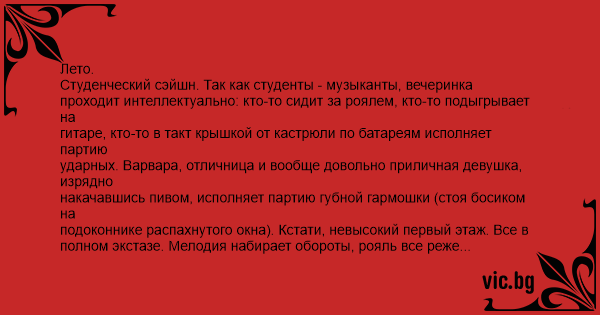Лето. Студенческий сэйшн. Так как студенты - музыканты, вечеринка проходит интеллектуально: кто-то сидит за роялем, кто-то подыгрывает на гитаре, кто-то в такт крышкой от кастрюли по батареям исполняет партию ударных. Варвара, отличница и вообще довольно приличная девушка, изрядно накачавшись пивом, исполняет партию губной гармошки (стоя босиком на подоконнике распахнутого окна). Кстати, невысокий первый этаж. Все в полном экстазе. Мелодия набирает обороты, рояль все реже попадает по клавишам правильно, Варвара раскачивается в такт. Народ явно исполняет музыку в ударе. Вдруг в момент музыкального апогея Варвара после особенно сильного качка скатывается с окна на улицу. 12 часов ночи. Август, темно уже. Мы в пылу музыкального рвения не замечаем потери бойца. Варвара: "Вывалившись из окна, я немного прокатилась вниз по склону (а дом стоял на небольшом холме). Но схватившись за куст и продолжая напевать мелодию, чтобы не потерять ритм, я карабкаюсь обратно, держа гармошку в зубах, залезаю на окно, снова встаю на подоконник и продолжаю играть свою партию". Люди, спавшие в соседней с нами квартире на первом этаже: "Спим. Вдруг к нам на подоконник влезает, икая, всклокоченное чучело в репейником в волосах и с грязной физиономией, в хайратнике, с гармошкой в зубах. Произносит что-то типа: "Вот блин, давайте с третьего такта по новой..." и начинает, жутко фальшивя, дудеть в гармошку..." Варвару мы разыскали через полчаса, долго извиняясь, забирали ее обратно из соседней квартиры. multer.ru