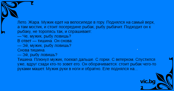 Лето. Жара. Мужик едет на велосипеде в гору. Поднялся на самый верх, а там мостик, и стоит посередине рыбак, рыбу рыбачит. Подходит он к рыбаку, не торопясь так, и спрашивает: