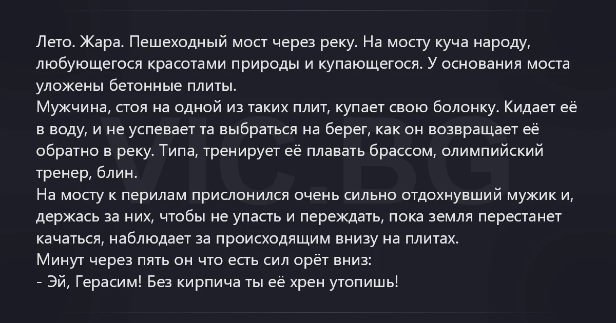 Лето. Жара. Пешеходный мост через реку. На мосту куча народу, любующегося красотами природы и купающегося. У основания моста уложены бетонные плиты. Мужчина, стоя на одной из таких плит, купает свою болонку. Кидает её в воду, и не успевает та выбраться на берег, как он возвращает её обратно в реку. Типа, тренирует её плавать брассом, олимпийский тренер, блин. На мосту к перилам прислонился очень сильно отдохнувший мужик и, держась за них, чтобы не упасть и переждать, пока земля перестанет качаться, наблюдает за происходящим внизу на плитах. Минут через пять он что есть сил орёт вниз: - Эй, Герасим! Без кирпича ты её хpeн утопишь!