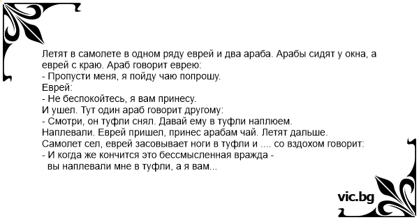 Двама араби пътували със самолет към Ню Йорк. Преди излитането на борда се качил евреин и седнал до арабите. Свалил си обувките и си размърдал пръстите на краката. По едно време единият арабин казал: