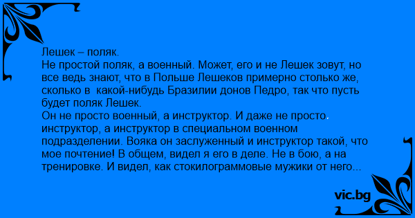 Он не просто военный, а инструктор. И даже не просто инструктор, а инструктор в специальном военном подразделении. Вояка он заслуженный и инструктор такой, что мое почтение! В общем, видел я его в деле. Не в бою, а на тренировке. И видел, как стокилограммовые мужики от него разлетались, будто легкие кегли, хотя он их даже и не бил (кажется) и не толкал (вроде бы). Своим курсантам Лешек, прежде всего, говорит о том, что физическая подготовка – это хорошо. Это даже прекрасно. Но если к накачанным рукам и ногам не прилагается мыслящая голова, то считай, что тебя плохо готовили к выполнению боевой задачи и вообще зря учили. Сам Лешек имеет широкий кругозор и прекрасно разбирается в истории, в том числе, в истории войн и в политической истории.