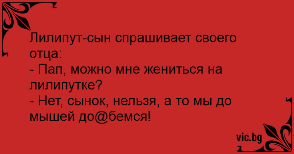 Лилипут-сын спрашивает своего отца:<br />- Пап, можно мне жениться на лилипутке?<br />- Нет, сынок, нельзя, а то мы до мышей до@бемся!