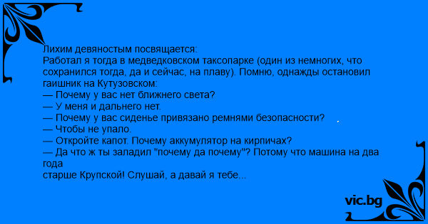 Лихим девяностым посвящается: Работал я тогда в медведковском таксопарке (один из немногих, что сохранился тогда, да и сейчас, на плаву). Помню, однажды остановил гаишник на Кутузовском: — Почему у вас нет ближнего света? — У меня и дальнего нет. — Почему у вас сиденье привязано ремнями безопасности? — Чтобы не упало. — Откройте капот. Почему аккумулятор на кирпичах? — Да что ж ты заладил "почему да почему"? Потому что машина на два года старше Крупской! Слушай, а давай я тебе рублей тридцать дам, и ты мне номера снимешь? Без номера машину поставят на прикол, а так как хуже этой в парке не было, значит, мне дадут что-то хоть немного лучше. Гаишник сообразил, посуровел: — Проезжайте. — То есть как проезжать? И ничего? — И ничего. Ну не скотина?