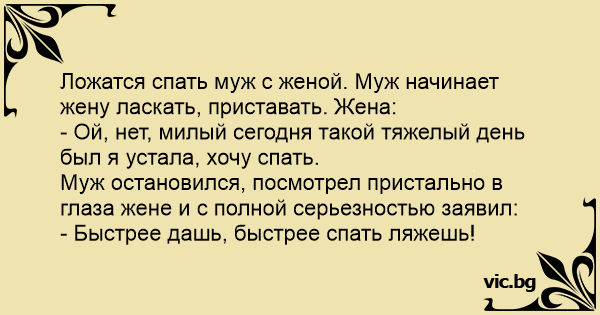Ложатся спать муж с женой. Муж начинает жену ласкать, приставать. Жена: - Ой, нет, милый сегодня такой тяжелый день был я устала, хочу спать. Муж остановился, посмотрел пристально в глаза жене и с полной серьезностью заявил: - Быстрее дашь, быстрее спать ляжешь!