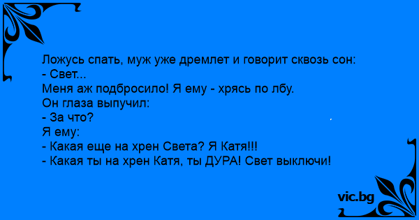 Ложусь спать, муж уже дремлет и говорит сквозь сон:<br />- Свет...<br />Меня аж подбросило! Я ему - хрясь по лбу. <br />Он глаза выпучил:<br />- За что?<br />Я ему:<br />- Какая еще на хpeн Света? Я Катя!!!<br />- Какая ты на хpeн Катя, ты ДУРА! Свет выключи!