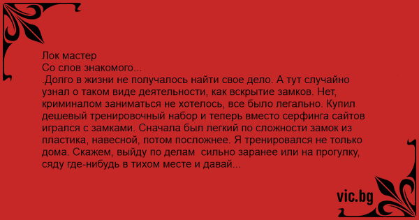 .Долго в жизни не получалось найти свое дело. А тут случайно узнал о таком виде деятельности, как вскрытие замков. Нет, криминалом заниматься не хотелось, все было легально. Купил дешевый тренировочный набор и теперь вместо серфинга сайтов игрался с замками. Сначала был легкий по сложности замок из пластика, навесной, потом посложнее. Я тренировался не только дома. Скажем, выйду по делам сильно заранее или на прогулку, сяду где-нибудь в тихом месте и давай ковыряться. Увлекся вообщем.