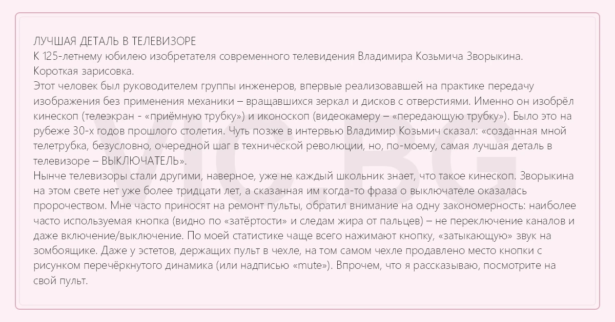 ЛУЧШАЯ ДЕТАЛЬ В ТЕЛЕВИЗОРЕ К 125-летнему юбилею изобретателя современного телевидения Владимира Козьмича Зворыкина. Короткая зарисовка. Этот человек был руководителем группы инженеров, впервые реализовавшей на практике передачу изображения без применения механики – вращавшихся зеркал и дисков с отверстиями. Именно он изобрёл кинескоп (телеэкран - «приёмную трубку») и иконоскоп (видеокамеру – «передающую трубку»). Было это на рубеже 30-х годов прошлого столетия. Чуть позже в интервью Владимир Козьмич сказал: «созданная мной телетрубка, безусловно, очередной шаг в технической революции, но, по-моему, самая лучшая деталь в телевизоре – ВЫКЛЮЧАТЕЛЬ». Нынче телевизоры стали другими, наверное, уже не каждый школьник знает, что такое кинескоп. Зворыкина на этом свете нет уже более тридцати лет, а сказанная им когда-то фраза о выключателе оказалась пророчеством. Мне часто приносят на ремонт пульты, обратил внимание на одну закономерность: наиболее часто используемая кнопка (видно по «затёртости» и следам жира от пальцев) – не переключение каналов и даже включение/выключение. По моей статистике чаще всего нажимают кнопку, «затыкающую» звук на зомбоящике. Даже у эстетов, держащих пульт в чехле, на том самом чехле продавлено место кнопки с рисунком перечёркнутого динамика (или надписью «mute»). Впрочем, что я рассказываю, посмотрите на свой пульт.