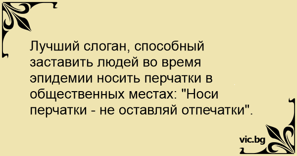 Лучший слоган, способный заставить людей во время эпидемии носить перчатки в общественных местах: "Носи перчатки - не оставляй отпечатки".