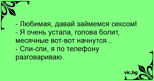 Мажот и жената во кревет. - Мажот: Дали си расположена за секс? - Жената (поспано): - Не можам, уморна сум, а и главата ме боли. Мажот: Не бе, спиј си ти, зборувам на телефон...