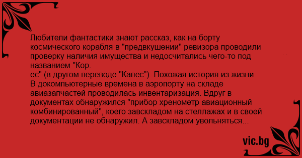 Любители фантастики знают рассказ, как на борту космического корабля в "предвкушении" ревизора проводили проверку наличия имущества и недосчитались чего-то под названием "Кор.