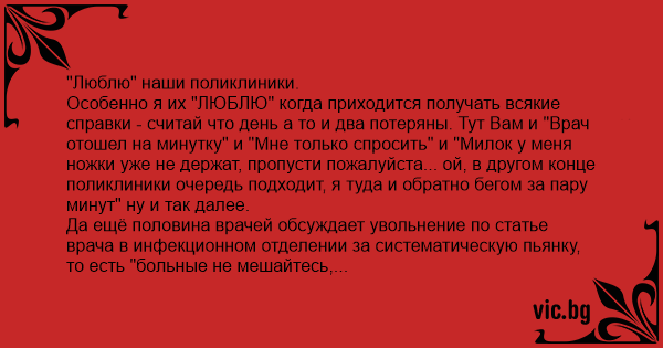 В итоге просидев три часа в очереди решил выйти покурить за угол. И тут услышал фразу в разговоре двух эскулапов в белых халатах которая сделала мой день: