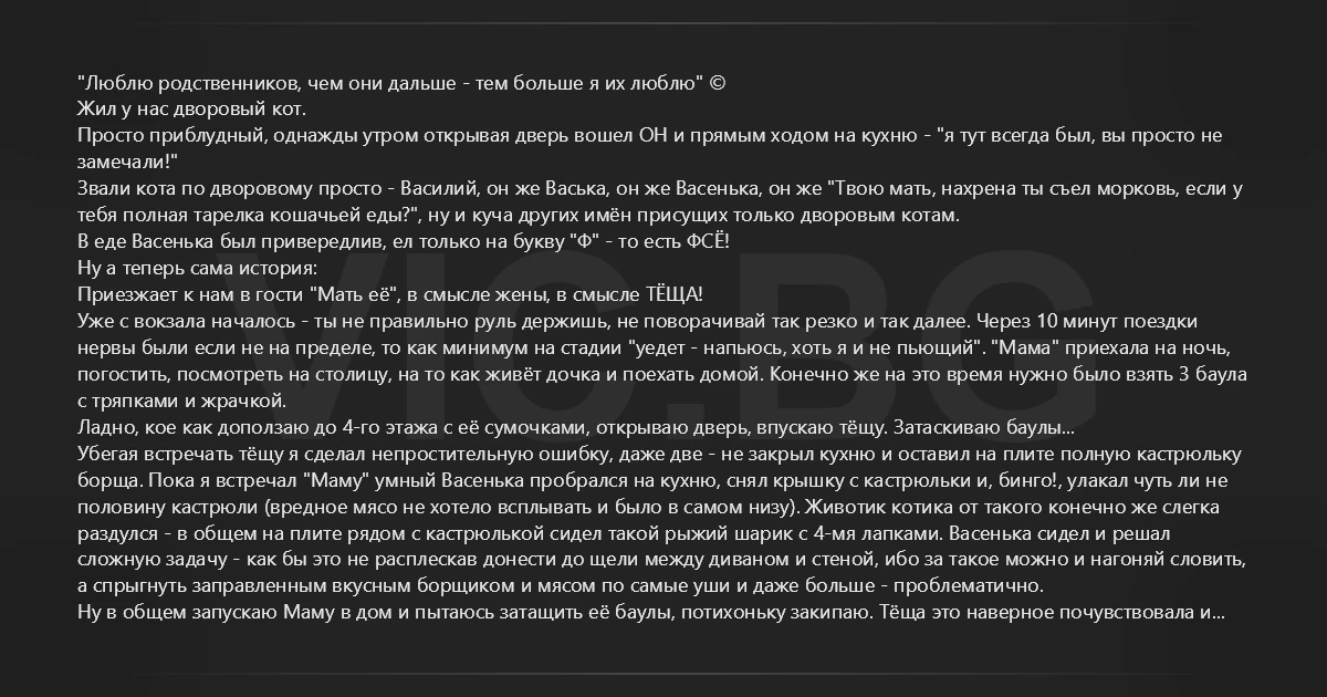 "Люблю родственников, чем они дальше - тем больше я их люблю" © Жил у нас дворовый кот.<br />Просто приблудный, однажды утром открывая дверь вошел ОН и прямым ходом на кухню - "я тут всегда был, вы просто не замечали!"<br />Звали кота по дворовому просто - Василий, он же Васька, он же Васенька, он же "Твою мать, нахрена ты съел морковь, если у тебя полная тарелка кошачьей еды?", ну и куча других имён присущих только дворовым котам.<br />В еде Васенька был привередлив, ел только на букву "Ф" - то есть ФСЁ!<br />Ну а теперь сама история:<br />Приезжает к нам в гости "Мать её", в смысле жены, в смысле ТЁЩА!<br />Уже с вокзала началось - ты не правильно руль держишь, не поворачивай так резко и так далее. Через 10 минут поездки нервы были если не на пределе, то как минимум на стадии "уедет - напьюсь, хоть я и не пьющий". "Мама" приехала на ночь, погостить, посмотреть на столицу, на то как живёт дочка и поехать домой. Конечно же на это время нужно было взять 3 баула с тряпками и жрачкой. <br />Ладно, кое как доползаю до 4-го этажа с её сумочками, открываю дверь, впускаю тёщу. Затаскиваю баулы... <br />Убегая встречать тёщу я сделал непростительную ошибку, даже две - не закрыл кухню и оставил на плите полную кастрюльку борща. Пока я встречал "Маму" умный Васенька пробрался на кухню, снял крышку с кастрюльки и, бинго!, улакал чуть ли не половину кастрюли (вредное мясо не хотело всплывать и было в самом низу). Животик котика от такого конечно же слегка раздулся - в общем на плите рядом с кастрюлькой сидел такой рыжий шарик с 4-мя лапками. Васенька сидел и решал сложную задачу - как бы это не расплескав донести до щели между диваном и стеной, ибо за такое можно и нагоняй словить, а спрыгнуть заправленным вкусным борщиком и мясом по самые уши и даже больше - проблематично. <br />Ну в общем запускаю Маму в дом и пытаюсь затащить её баулы, потихоньку закипаю. Тёща это наверное почувствовала и шмыгнула на кухню, да бы не мешаться под ногами. Села на табуреточку около плиты и изображает саму невинность. Мой любимый Васенька увидев такую хорошую "ступеньку" на которую можно спрыгнуть с высокой плиты и незамедлительно решил ей воспользоваться. Вот только... наклоняясь для прыжка котик не учёл - всё то что он до этого сожрал обладает, так сказать, повышенной текучестью - при наклоне весь борщик подступил к горлу и котик не удержался - сблевал прямо на колени Тёще, на новый молочно-белый костюм... <br />В общем "Мама" застирывала костюмчик в ванной до приезда с работы моей ненаглядной, а у меня было время не только отдохнуть от всего этого, но и поглаживая любимую рыжую cboлoчь выпить пару рюмок коньяка.