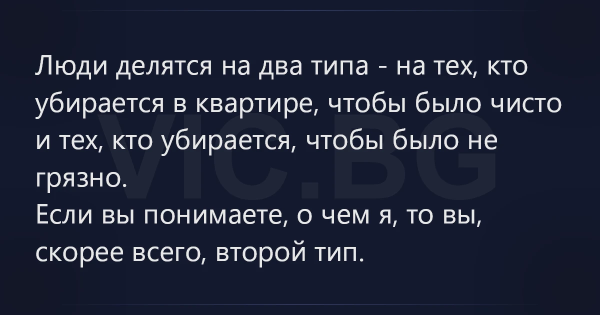 Люди делятся на два типа - на тех, кто убирается в квартире, чтобы было чисто и тех, кто убирается, чтобы было не грязно.
