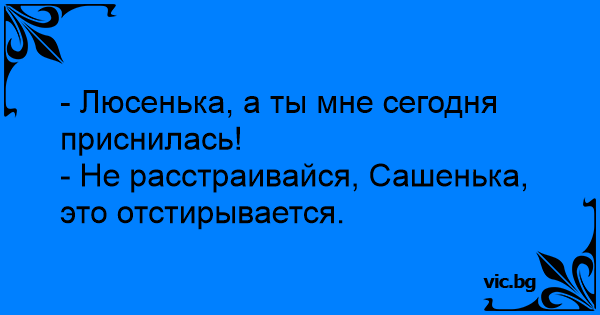 - Дорогая, ты мне приснилась! - Ничего дорогой - это отстирывается...