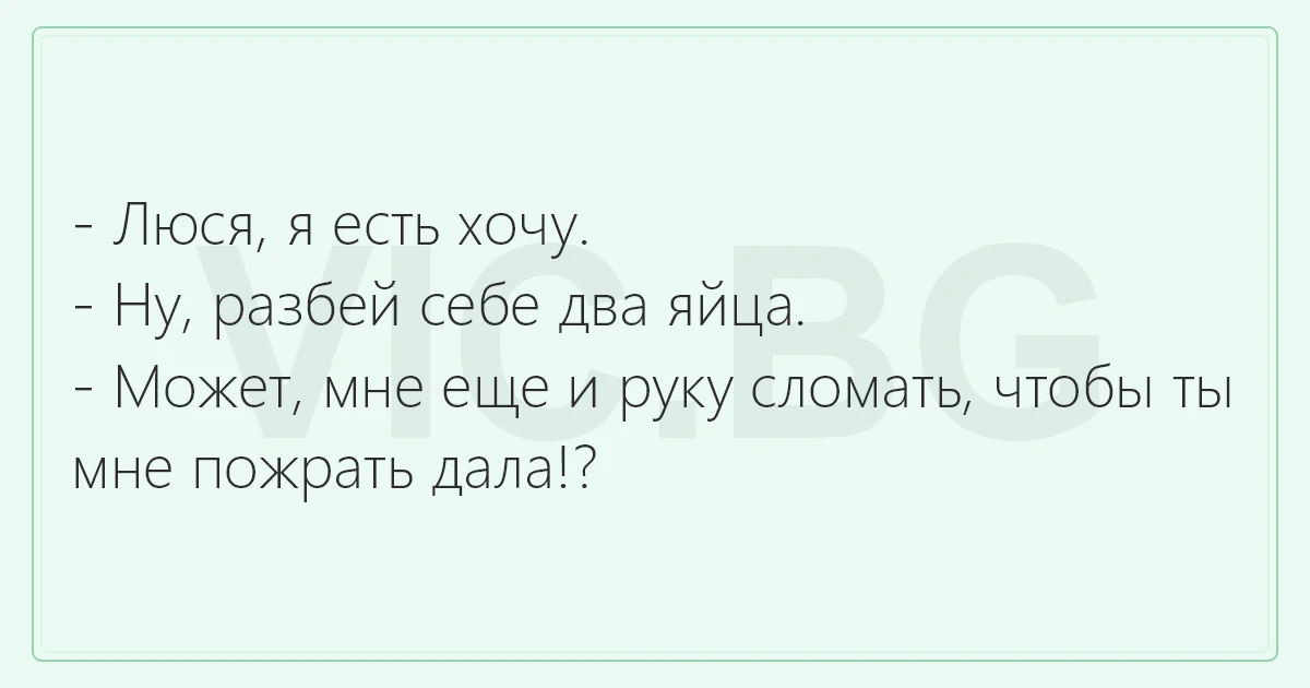 - Люся, я есть хочу. - Ну, разбей себе два яйца. - Может, мне еще и руку сломать, чтобы ты мне пожрать дала!?
