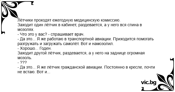 Заходит один лётчик в кабинет, раздевается, а у него вся спина в мозолях.