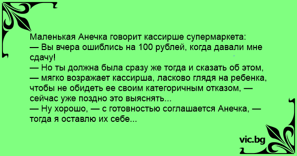 Маленькая Анечка говорит кассирше супермаркета: