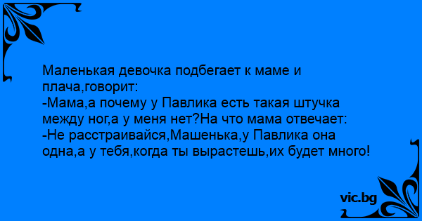 -Мама,а почему у Павлика есть такая штучка между ног,а у меня нет?На что мама отвечает: