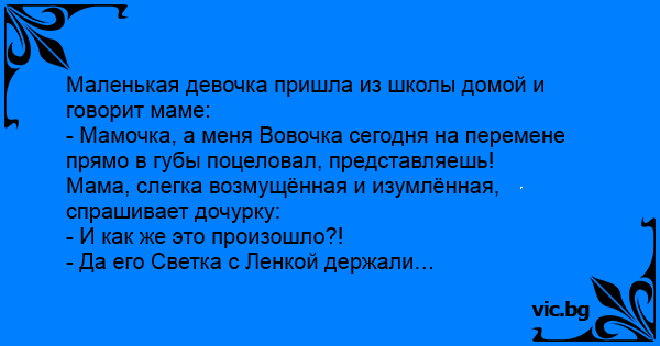 - Мамочка, а меня Вовочка сегодня на перемене прямо в губы поцеловал, представляешь!