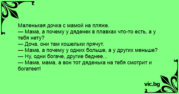— Мама, мама, а вон тот дяденька на тебя смотрит и богатеет!