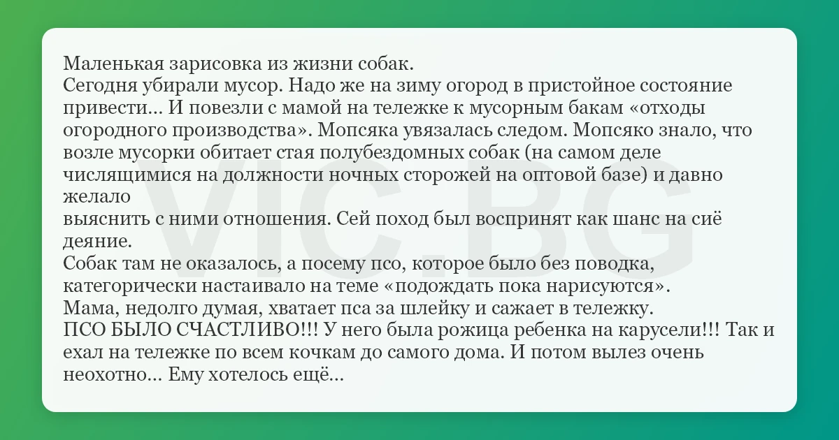 Маленькая зарисовка из жизни собак. Сегодня убирали мусор. Надо же на зиму огород в пристойное состояние привести… И повезли с мамой на тележке к мусорным бакам «отходы огородного производства». Мопсяка увязалась следом. Мопсяко знало, что возле мусорки обитает стая полубездомных собак (на самом деле числящимися на должности ночных сторожей на оптовой базе) и давно желало выяснить с ними отношения. Сей поход был воспринят как шанс на сиё деяние. Собак там не оказалось, а посему псо, которое было без поводка, категорически настаивало на теме «подождать пока нарисуются». Мама, недолго думая, хватает пса за шлейку и сажает в тележку. ПСО БЫЛО СЧАСТЛИВО!!! У него была рожица ребенка на карусели!!! Так и ехал на тележке по всем кочкам до самого дома. И потом вылез очень неохотно… Ему хотелось ещё…