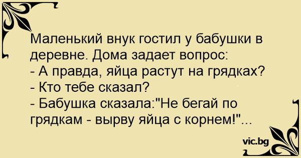 - Бабушка сказала:"Не бегай по грядкам - вырву яйца с корнем!"...