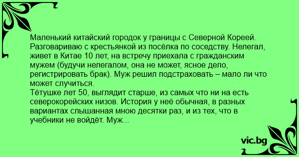 Тётушке лет 50, выглядит старше, из самых что ни на есть северокорейских низов. История у неё обычная, в разных вариантах слышанная мною десятки раз, и из тех, что в учебники не войдёт. Муж умер в голод, осталась в провинциальном городке в середине девяностых с двумя детьми на руках, крутилась как могла. Спрашиваю, как оказалась в Китае. Говорит, что ей предложили нелегально перейти границу, чтобы поработать сезон на рисовых полях, обещали за эту работу большие деньги. Внешним миром она не интересовалась совершенно, но слухи о том, что люди, съездившие в Китай на работу, живут хорошо, ходили широко, поэтому она и отправилась, как ей казалось, на работу в Китай. По прибытии она обнаружила, что её, как часто в те времена случалось, просто продали в семью китайского крестьянина корейского происхождения, существенно старше её, конечно, который овдовел и не мог найти себе жену (все бабы с девками из деревень слиняли в города).