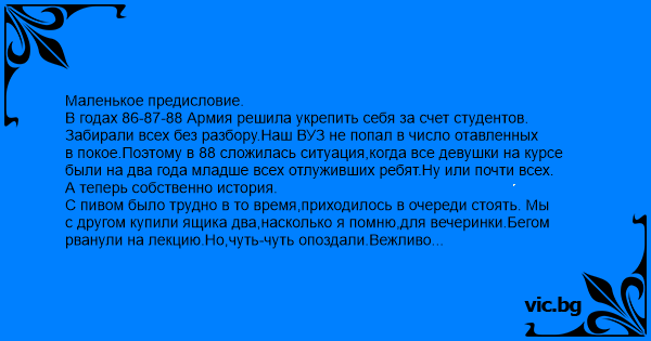 Маленькое предисловие. В годах 86-87-88 Армия решила укрепить себя за счет студентов. Забирали всех без разбору.Наш ВУЗ не попал в число отавленных в покое.Поэтому в 88 сложилась ситуация,когда все девушки на курсе были на два года младше всех отлуживших ребят.Ну или почти всех. А теперь собственно история. С пивом было трудно в то время,приходилось в очереди стоять. Мы с другом купили ящика два,насколько я помню,для вечеринки.Бегом рванули на лекцию.Но,чуть-чуть опоздали.Вежливо попросив старенького преподователя войти, начали медленно подниматься по амфитеатру аудитории,бережно таща огромные сумки.Все вокруг прекрасно знали, какой бесценный груз мы несем.Все бы хорошо,но подвела ручка у сумки. Ничего не разбилось,только благодаря мужеству и реакции ближайших товарищей. Несколько бутылок ,старательно позвякивая, скатились по ступеням прямо под ноги лектору.Все замерли. Реакция была такова.Натренированным голосом он сказал: - Молодые люди.Заберите пожалуйста ваши вещи. Слава Богу на курсе снова мужики появились. Два года институт одних девчонок выпускал. Итак, Прикладная Теория Цифровых Автоматов представляет .......